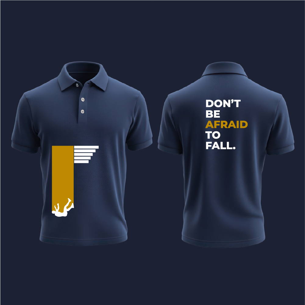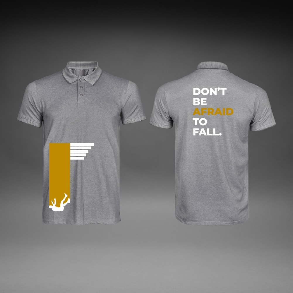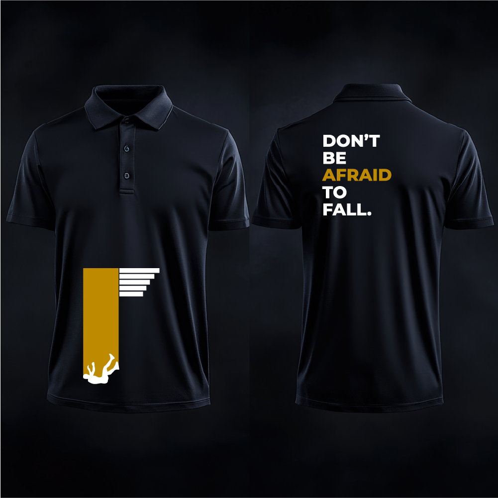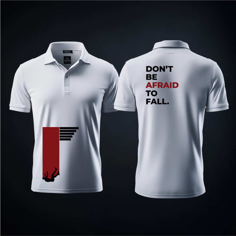 Embrace courage and resilience with this bold polo shirt that speaks to dreamers, risk-takers, and achievers. The front features a striking minimalist design. A silhouette in free fall beside a deep red vertical bar, symbolizing the leap of faith that leads to growth. On the back, the empowering message “DON’T BE AFRAID TO FALL.” stands out in black and red typography, inspiring confidence with every wear.