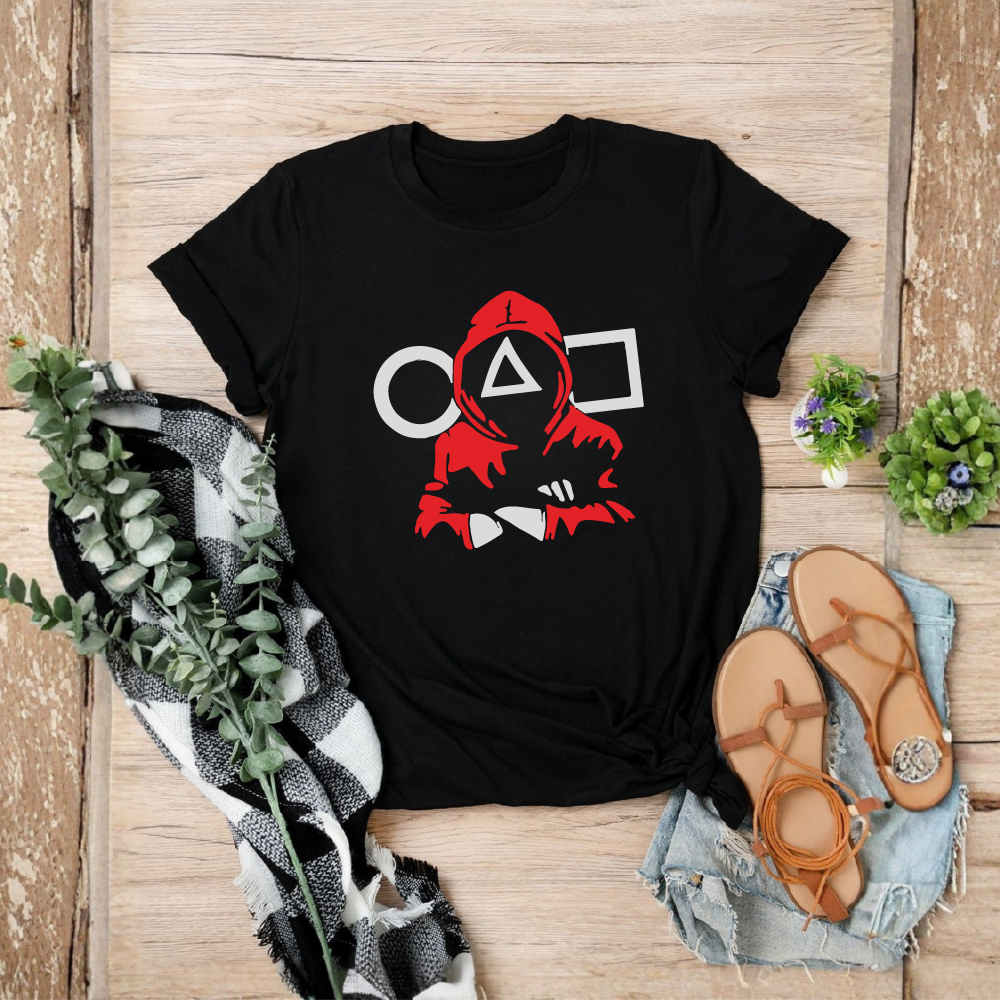 The Survival Game T-Shirt takes inspiration from the intense world of high-stakes competition and mystery. Featuring the iconic circle, triangle, and square symbols with a bold red masked figure silhouette, it captures the essence of strategy, power, and control. The sleek sleeve design adds a tactical edge, symbolizing hierarchy and precision. Crafted from premium cotton-blend fabric, this hoodie offers warmth, comfort, and durability. Perfect for fans of thrilling challenges and those who embrace bold, statement-making streetwear.