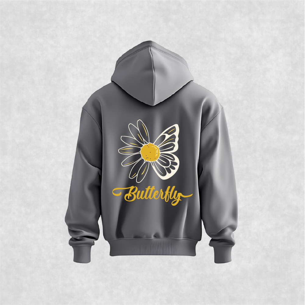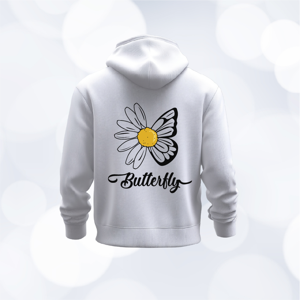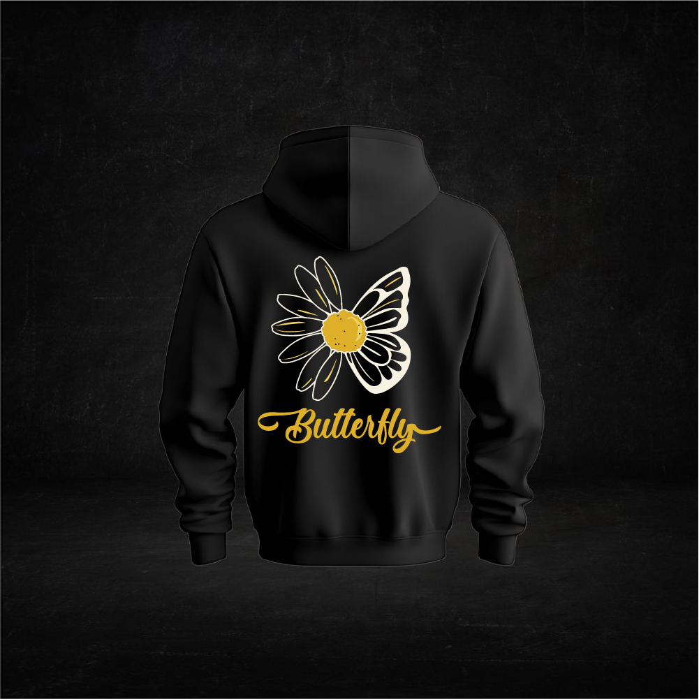 The Butterfly Bloom Hoodie captures the beauty of transformation and nature in a stunning minimalist design. Featuring a half-daisy, half-butterfly graphic in soft yellow and white tones, this artwork symbolizes growth, freedom, and positivity. The elegant cursive “Butterfly” text beneath the design adds a graceful finishing touch, making it both stylish and meaningful. The golden hues stand out beautifully against the deep black fabric, creating a bold yet calming aesthetic. Crafted from premium, soft cotton-blend material, this hoodie offers warmth, comfort, and durability. Perfect for dreamers, nature lovers, and anyone embracing change with confidence and grace.