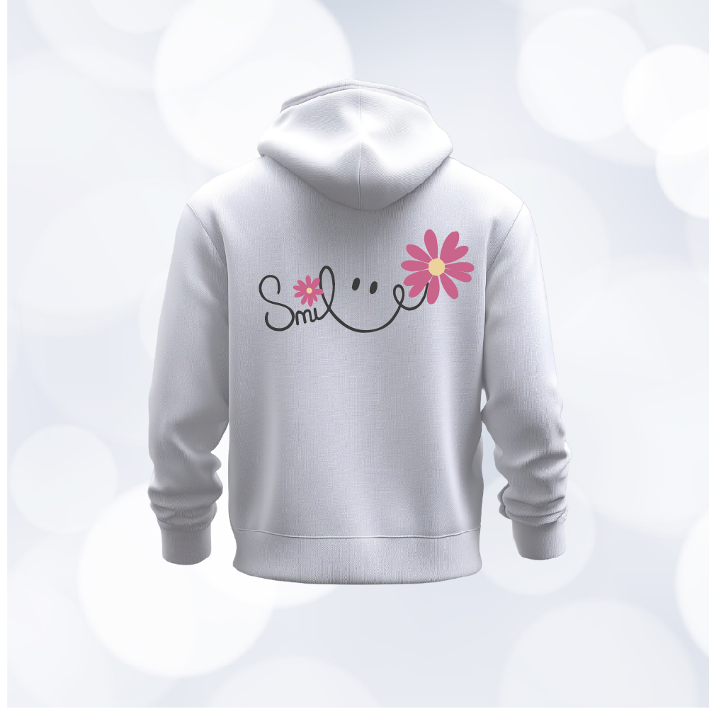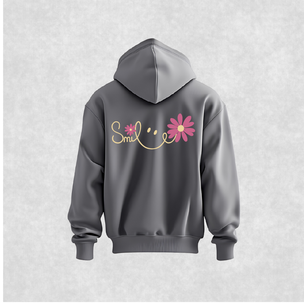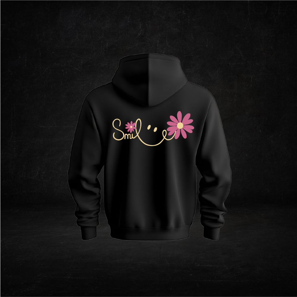 The Smile Flower Hoodie spreads positivity and charm with its playful, uplifting design. Featuring the word “Smile” written in a flowing yellow script that forms a cheerful smiley face, accented by two bright pink flowers, this hoodie radiates warmth and happiness. The vibrant artwork stands out beautifully against the sleek black fabric, creating a stylish and feel-good look. Made from soft, premium cotton-blend material, it offers cozy comfort and lasting quality. Perfect for anyone who believes in the power of a smile and loves adding a touch of joy to their everyday style.