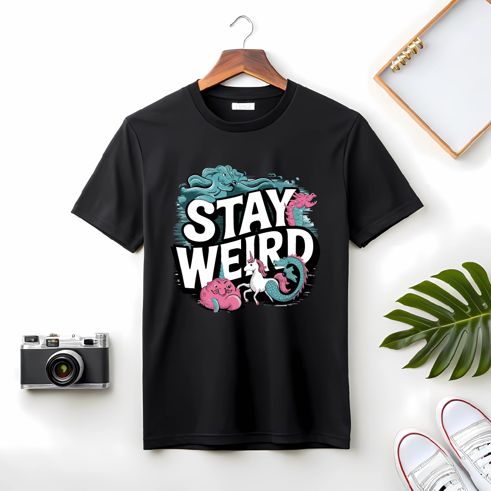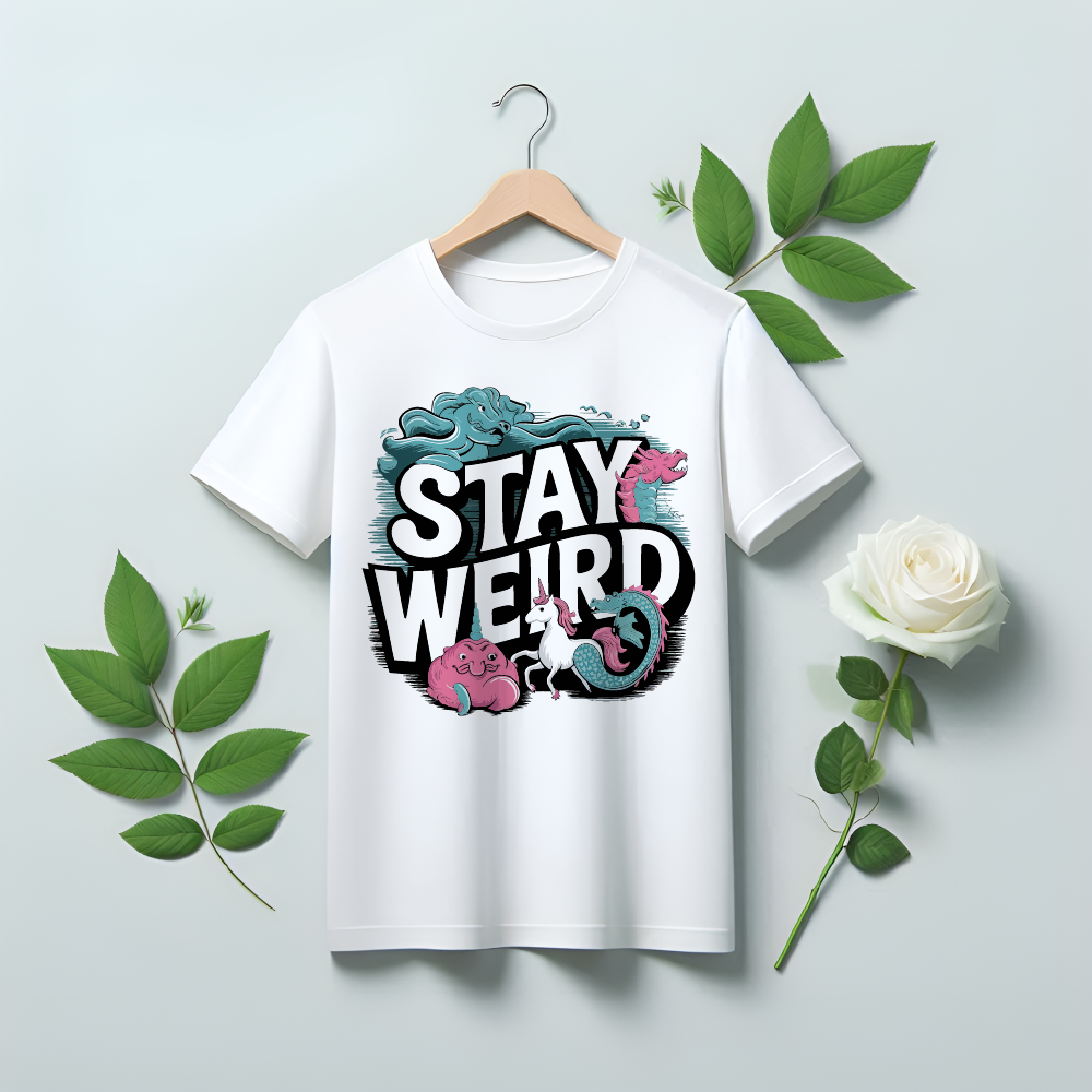 The “Stay Weird” Tee celebrates individuality and imagination with a playful, artistic twist. Featuring bold typography surrounded by whimsical creatures like a unicorn, octopus, and sea serpent in vibrant teal and pink hues, this design radiates creativity and fun. Perfect for dreamers, artists, and free spirits, it’s a reminder to embrace uniqueness and proudly stand out from the crowd.