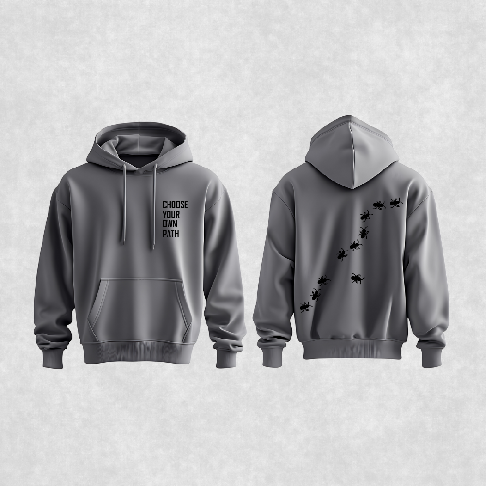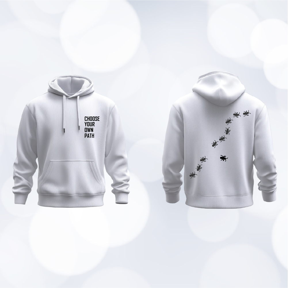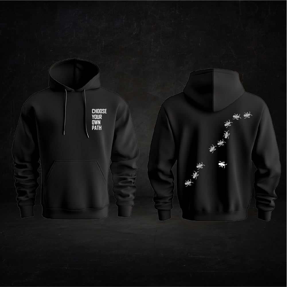 The Choose Your Own Path Hoodie is a bold statement of individuality and determination. Featuring the empowering phrase “CHOOSE YOUR OWN PATH” on the front and a unique trail of ants on the back, it symbolizes persistence, teamwork, and forging one’s own direction. Crafted from premium cotton-blend fabric, this hoodie offers exceptional comfort, warmth, and durability. Perfect for those who carve their own journey and embrace their unique path with confidence and purpose.