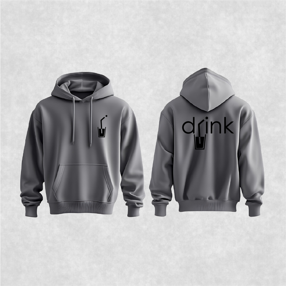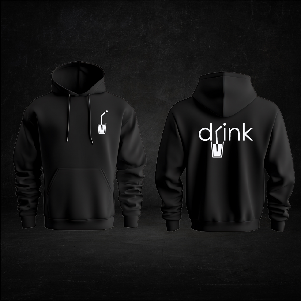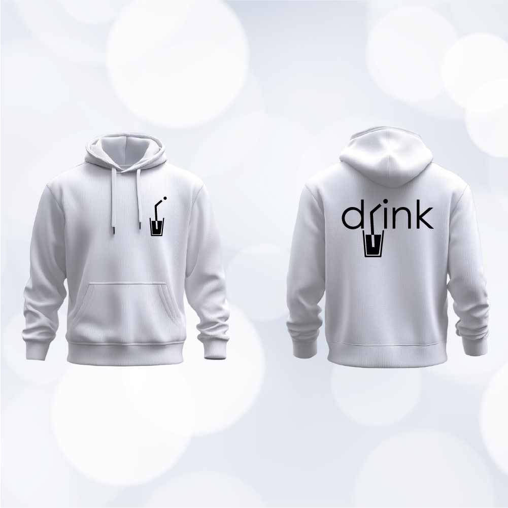DRINK Minimalist Graphic Hoodie. Featuring a clean white drink icon on the front and a bold “drink” text design on the back, this hoodie blends simplicity with modern streetwear flair.